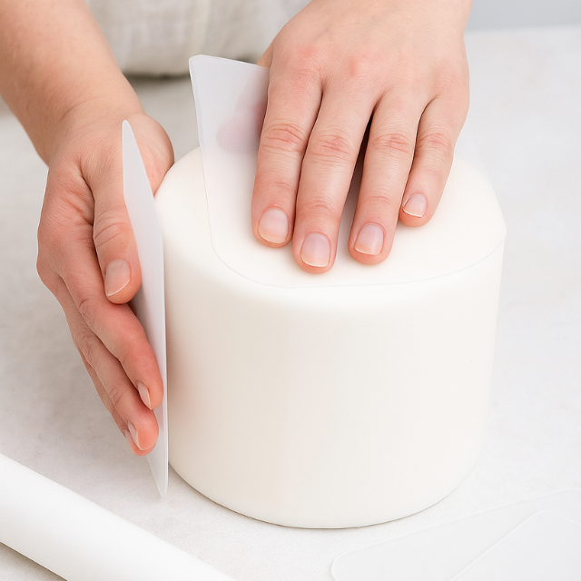 Cubre la torta, acomoda y adhiere la pasta con la palma de la mano. Corta el excedente y suaviza con alisador flexible mientras la pasta está suave